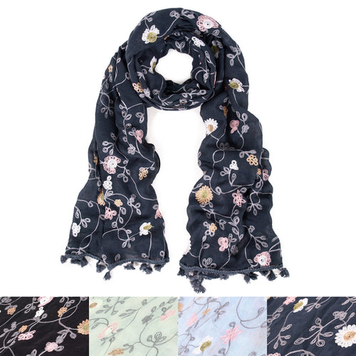 Premium Embroidered Floral Dainty Tassel Hem Scarf Wrap Shawl