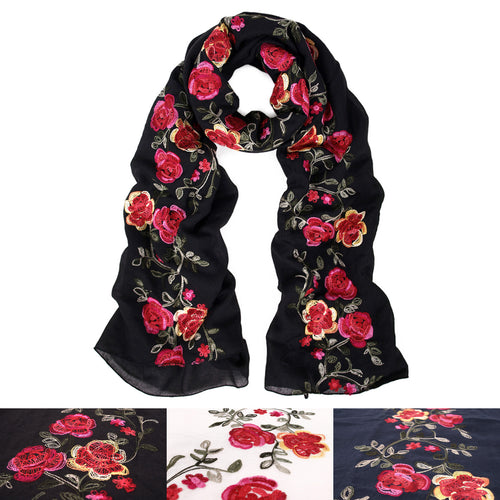 Premium Embroidered Floral Rose Patterned Border Scarf Wrap Shawl